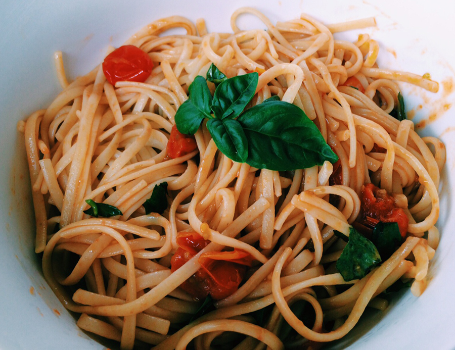 Spaghetti ze szpinakiem i pomidorkami cherry